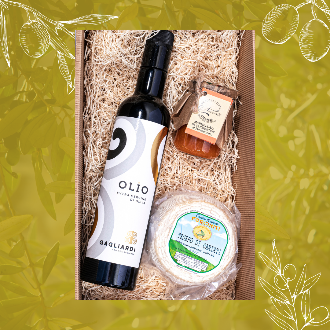 Nella GIFT BOX troverete: 1 bottiglia di olio extravergine 100% Bio, 1 forma di Caprino morbido, 1 confettura di marmellata di clementine piccanti.