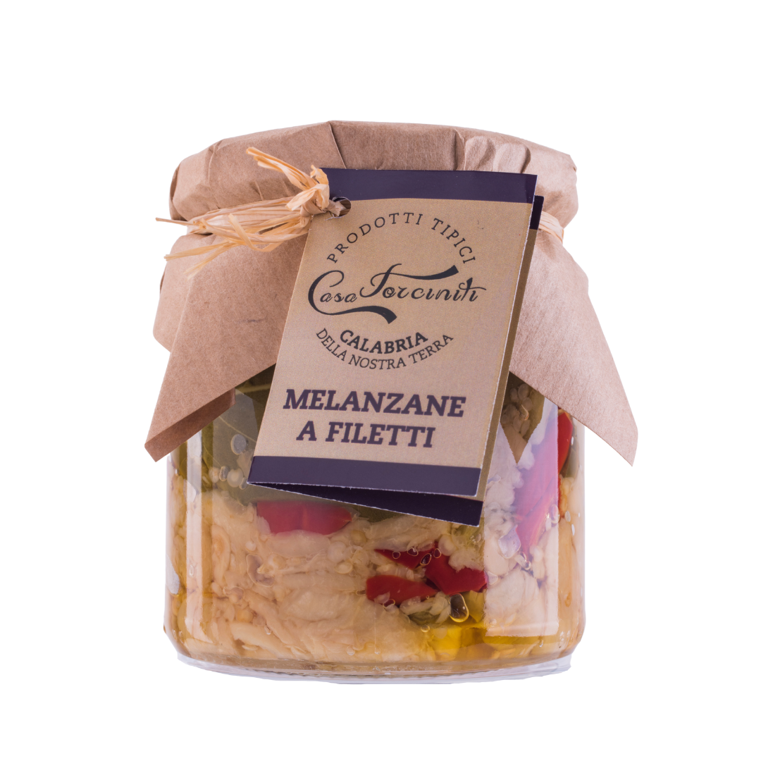 INGREDIENTI: melanzane a filetti, sale, aceto di vino bianco, olio di semi di girasole, alloro, aglio, peperoncino piccante.